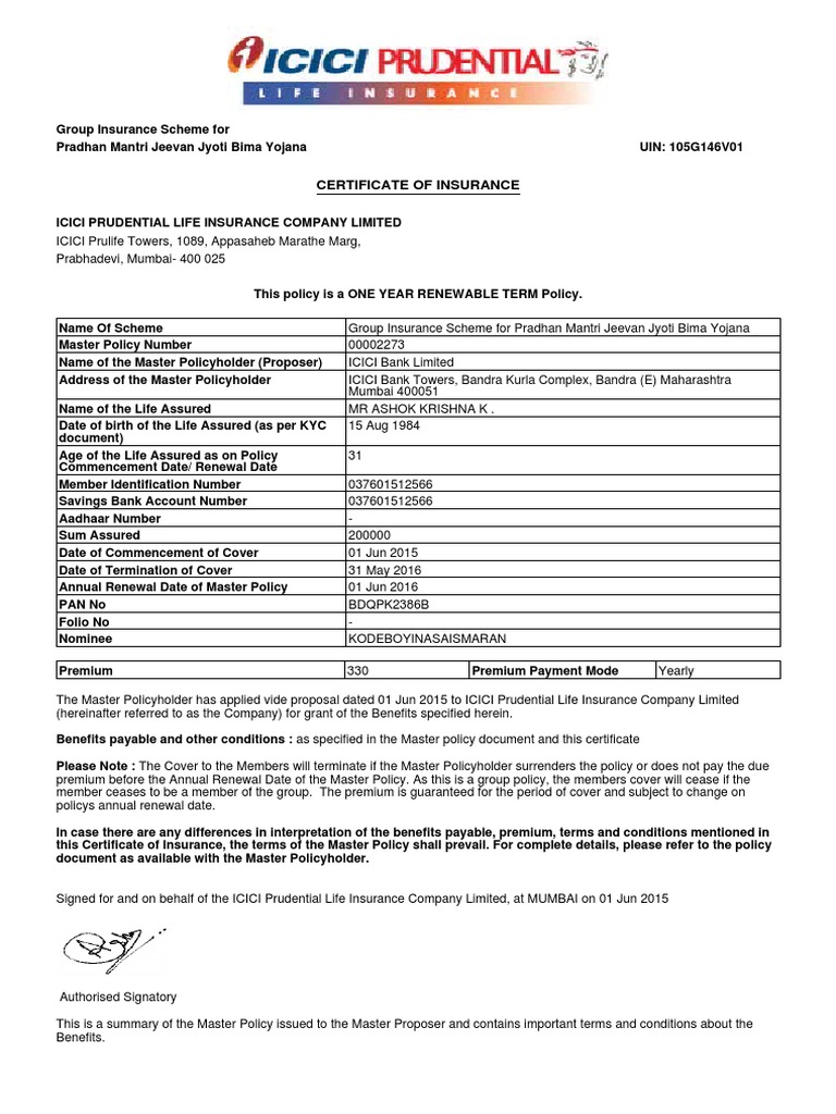 Coi Pmjjby Life Insurance Insurance