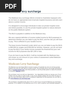 The percentage surcharge you pay depends on your income threshold as a single person or your combined income as a family which includes single parents and couples including de facto couples. Income thresholds and rates for the medicare levy surcharge. It is designed to encourage individuals to take out private hospital cover and where possible to use the private hospital system to reduce demand on the public medicare system. The medicare levy surcharge mls is a levy paid by australian tax payers who do not have private hospital cover and who earn above a certain income.