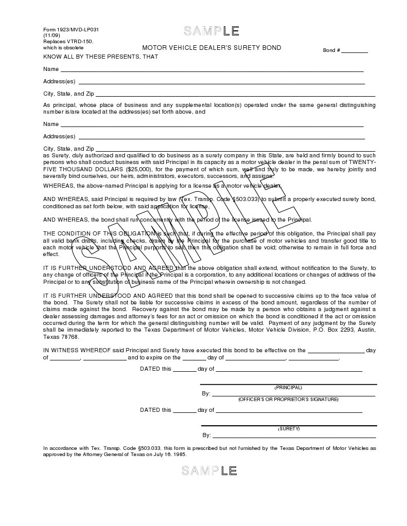 Texas Mvd Surety Bond Sample Form Surety Bond Bonds Finance