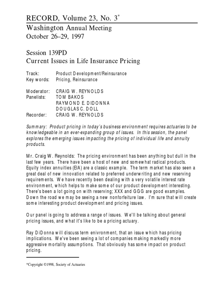 Current Issues In Life Insurance Pricing Pdf Reinsurance Insurance
